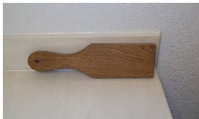 Another technique which can work better because it's quicker and easier, is to use the hairbrush paddle or the hairbrush hole paddle immediately on your bare thigh-top. The subconscious mind is always thinking, 'How likely is mommy to actually do it,' and so this is more powerful because likelier.