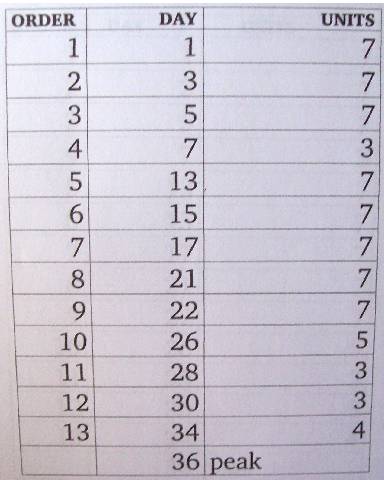 There was a time at which I was using quite a lot of spanking in my discipline, and it happened that over the course of 34 days, I got 13 of them. With the paddle. I’ll provide a chart which will depict the pattern graphically, but it was day 1 (7), day 3 (7), day 5 (7), day 7 (3), day 13 (7), day 15 (7), day 17 (7), day 21 (7), day 22 (7), day 26 (5), day 28 (3), day 30 (3), day 34 (4).